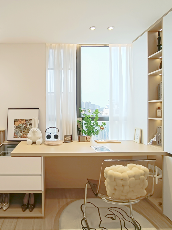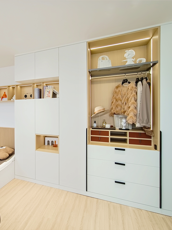 衣柜緊挨床尾做一字型一門到頂,中間配合墻面吊柜做延伸開放格設(shè)計,留足空間收納次凈衣,小格子抽可以放首飾。整個設(shè)計靈動又實用。