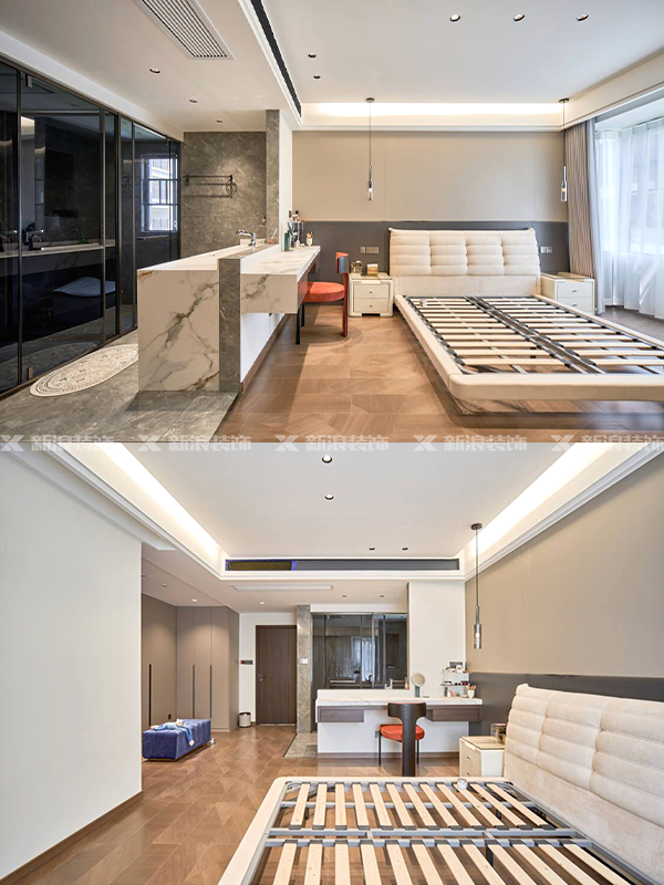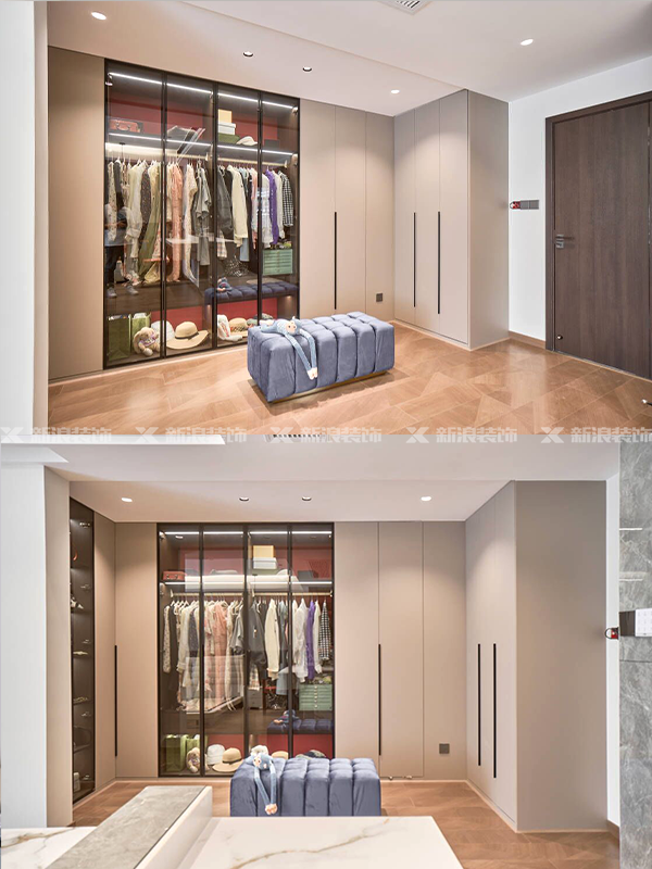 全房共定制了14個柜子,柜體采用足18厚杉木芯板,柜門采用LSB板PET膚感柜門,一門到頂,五金使用原裝進(jìn)口的百隆五金