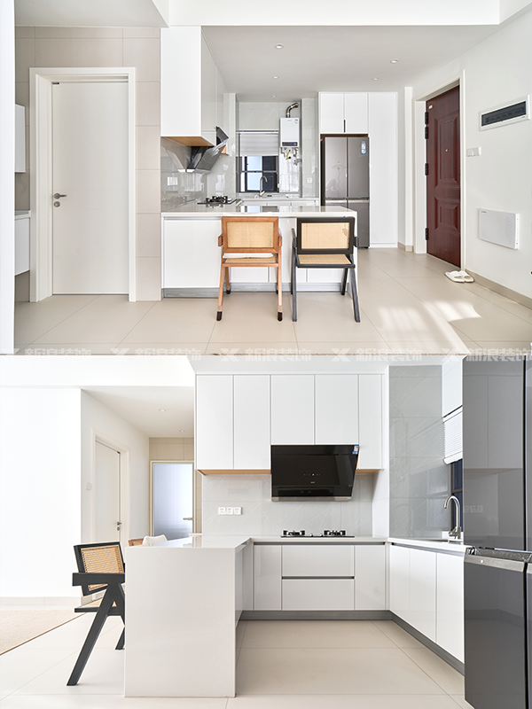 ??直接做開放式+吧臺餐桌,足夠一人或者小情侶兩人使用,冰箱嵌入定制柜,櫥柜和吊柜統(tǒng)一用象牙白,和全房色調(diào)統(tǒng)一,收納儲物無壓力!