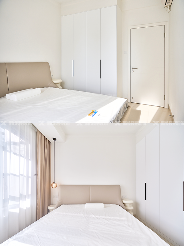 ??做靠墻做一門到頂衣柜,滿足一年四季衣物被褥收納。床頭柜和床頭吊燈的色彩搭配超美的,真的讓人不想起床!