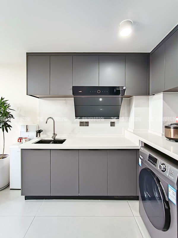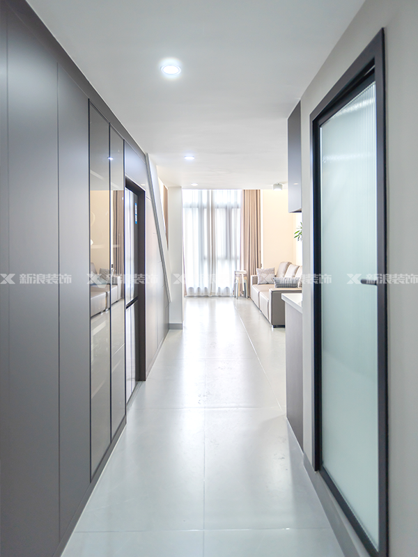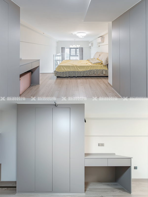 柜子做的高端定制膚感深灰色,反彈器開(kāi)合,整體更統(tǒng)一。衣物和家居收納完全不用愁~