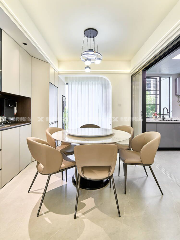 餐廳釋放了廚房空間,與陽(yáng)臺(tái)打通連接冰箱立柜以及家政柜。