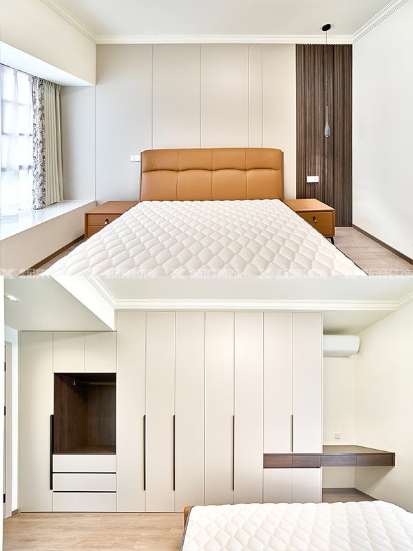 主臥的床尾位置做整墻衣柜,鏤空的掛取區(qū)可以掛取日常衣物。穿插式的設(shè)計(jì)做梳妝臺(tái),滿足了主人日常的各種需求。