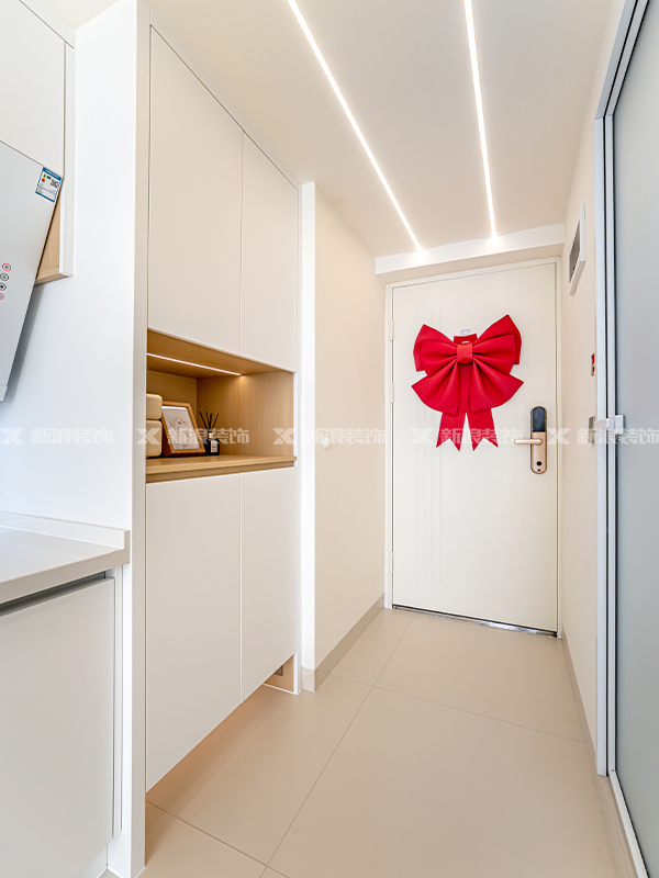 進(jìn)門一字型經(jīng)典結(jié)構(gòu),入戶鞋柜、廚房、洗手間在兩側(cè)一字排開。