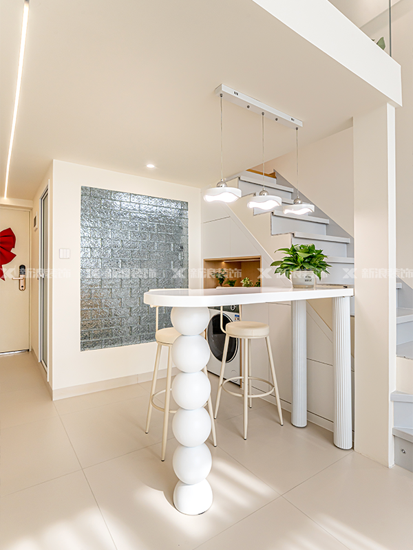 吧臺式條桌靠在樓梯柜旁,搭配三盞小吊燈,空間富有情調(diào)。
