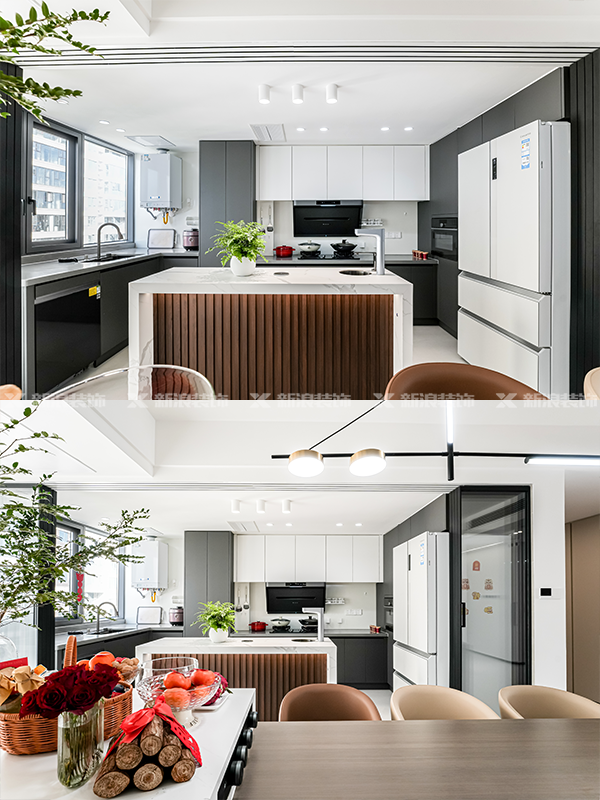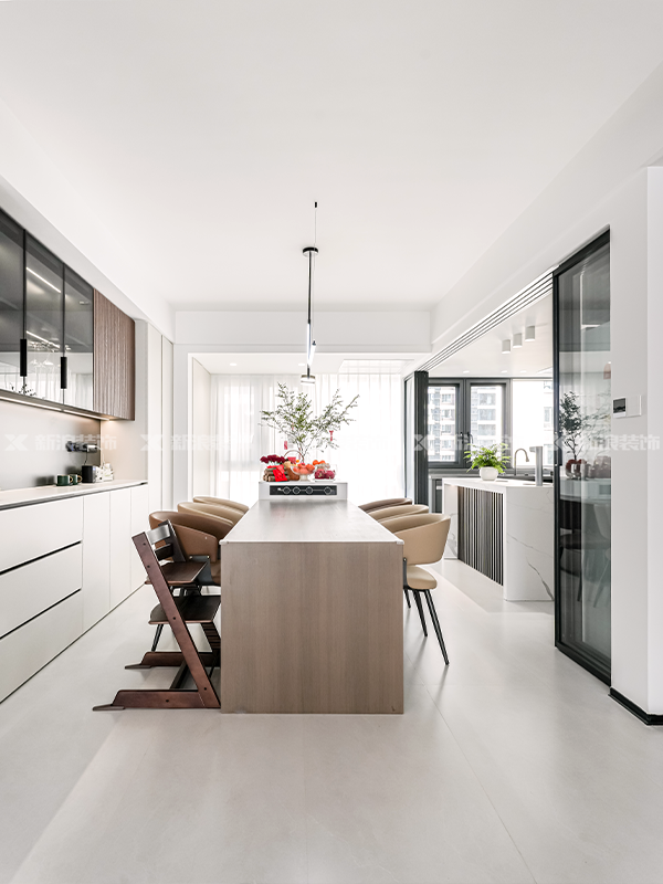 通過吊軌四聯(lián)動(dòng)玻璃門打造靈活多變的廚房空間,動(dòng)線流暢,家人之間也能更多互動(dòng)。