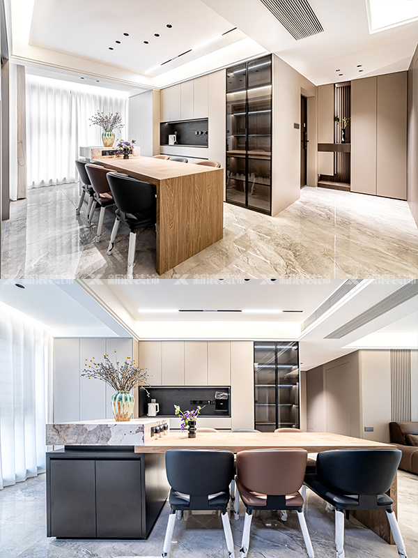 通過(guò)吊軌聯(lián)動(dòng)玻璃門打造靈活多變的廚房空間,廚房-餐島臺(tái)-水吧動(dòng)線流暢。