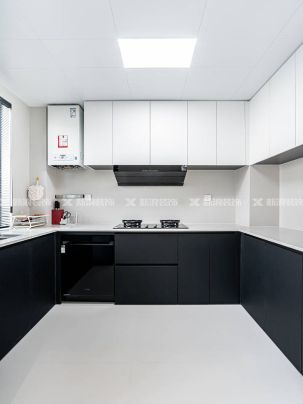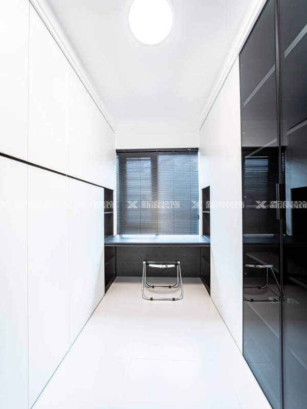 以簡約、線條明晰的黑白兩色為主色調(diào),全房同色瓷磚通鋪。