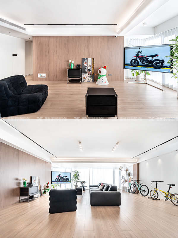 全屋地面采用木地板369通鋪,腳感舒適,視覺上也和木色墻板達(dá)成統(tǒng)一。