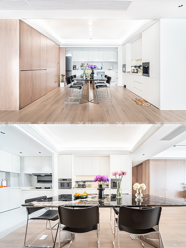 廚房改成了可開可閉的靈活設(shè)計(jì),四聯(lián)動玻璃推拉門,空間整體更通透。