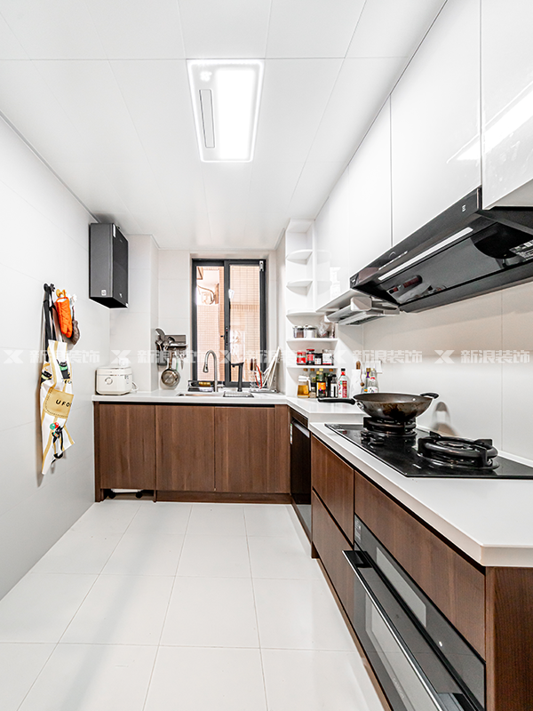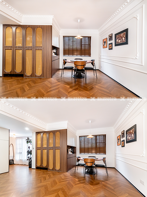全房通鋪魚骨紋復(fù)古瓷磚,搭配同色系木色高端定制柜體,質(zhì)感直接拉滿!藤編柜門和法式角花裝飾線條,細(xì)節(jié)控表示太愛了!每一處都經(jīng)得起推敲,審美在線!