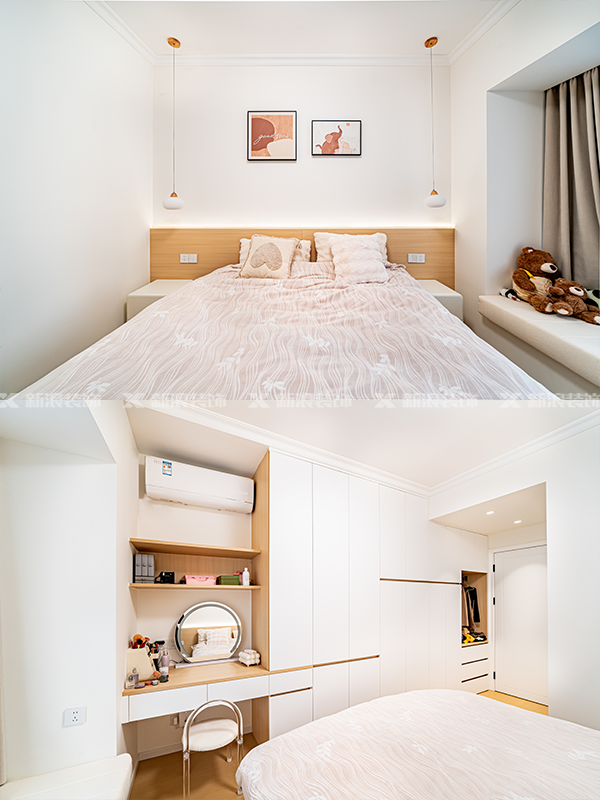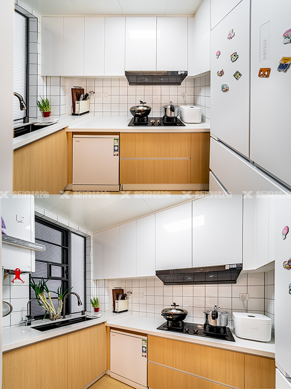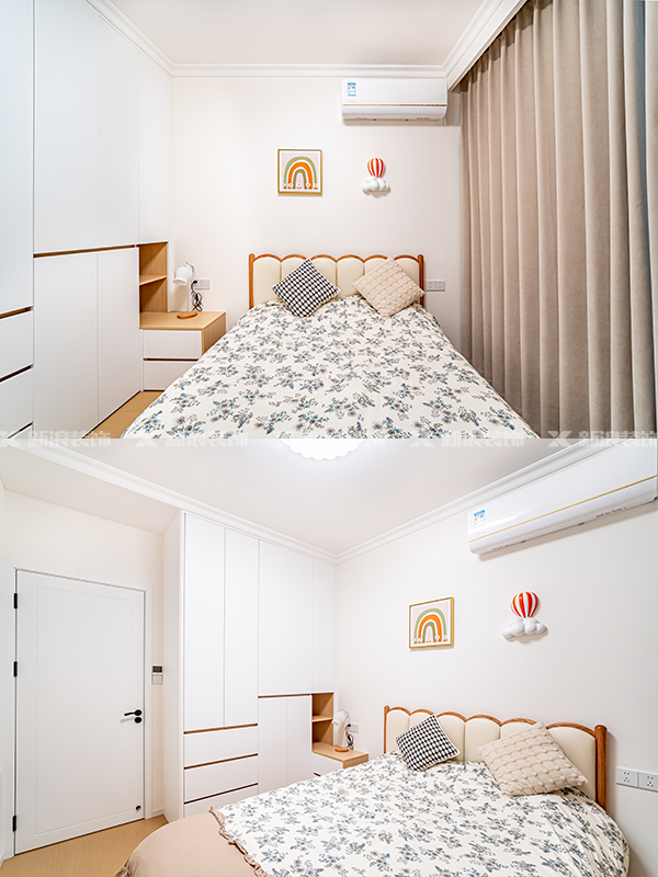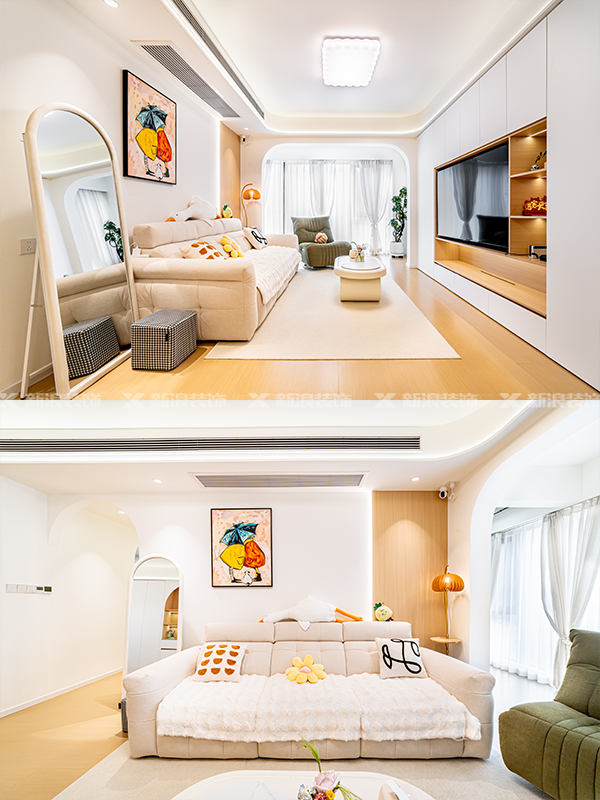 全屋定制配色用朗秋原木色搭配琥珀白,免拉手分段設(shè)計(jì),簡(jiǎn)約又舒適。
