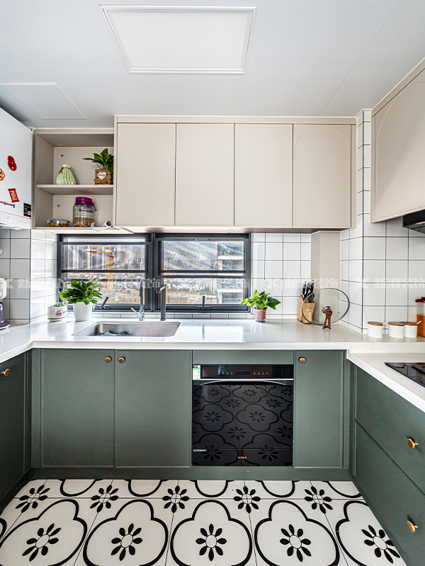 地面復(fù)古木紋磚通鋪,暖色調(diào)的木紋磚和胡桃木色、榆木色定制柜相得益彰,自然又溫馨。走起來(lái)腳感舒適,而且特別容易清潔打理,實(shí)用性拉滿