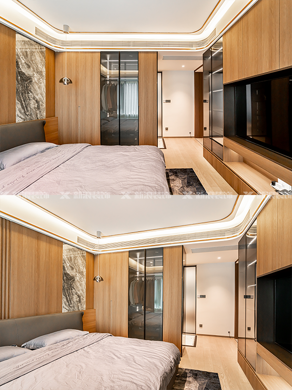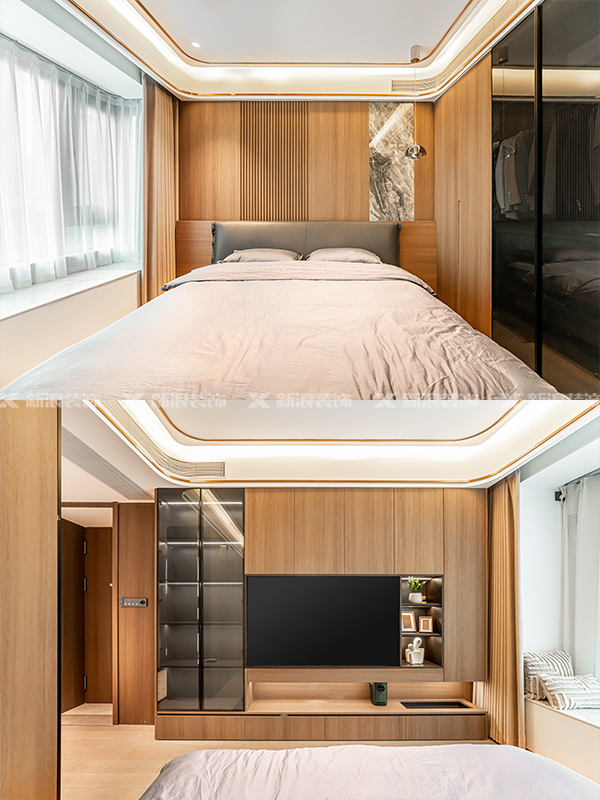 全屋定制一體化設(shè)計(jì),床頭木飾面硬包搭配吊頂香檳金線條,高級(jí)感瞬間拉滿!