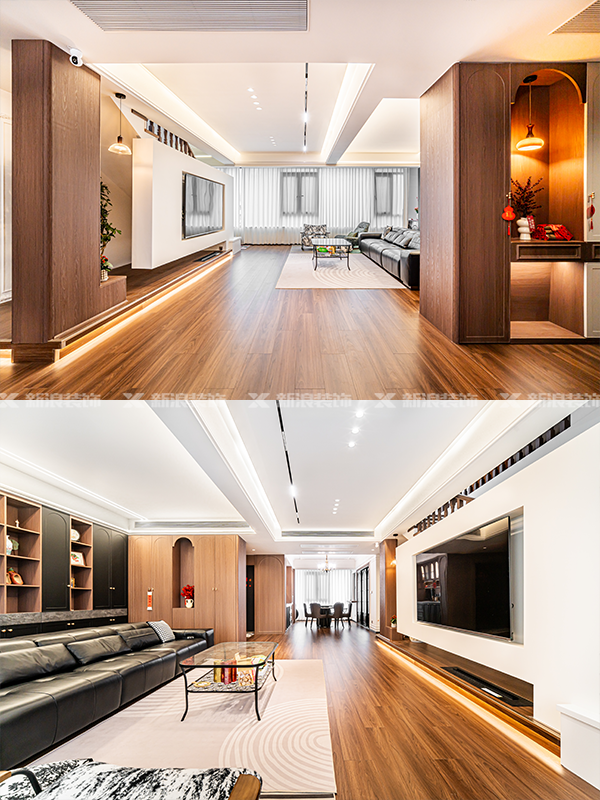 ? 電視背景墻:白色簡約懸浮+棕色地臺點(diǎn)綴,內(nèi)嵌暖光燈帶