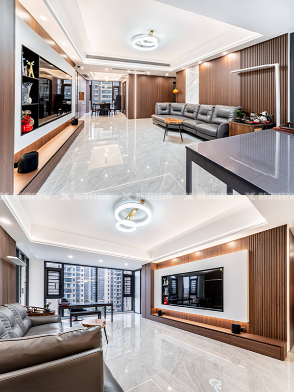 客餐廳和過道墻面做木飾面加格柵加大理石穿插