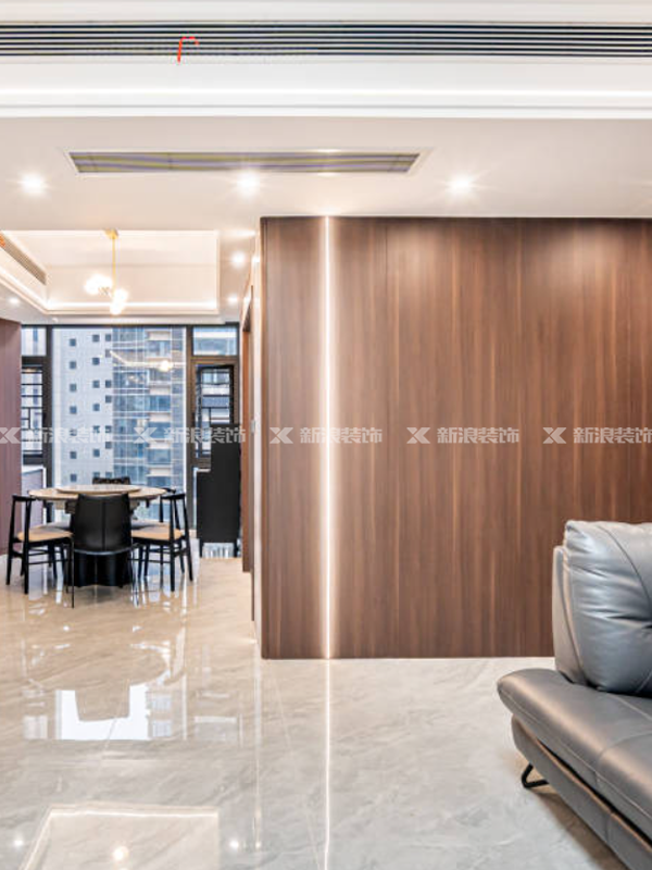 入戶空間、過道與客餐廳背景墻相互呼應(yīng),在視覺上擴(kuò)大穩(wěn)重大氣
