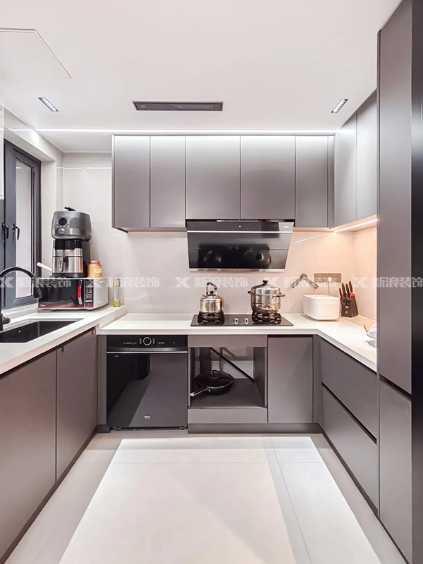 廚房三面櫥柜設(shè)計(jì),動(dòng)線超流暢!濟(jì)州灰柜門搭配隱形拉手,實(shí)用主義天花板