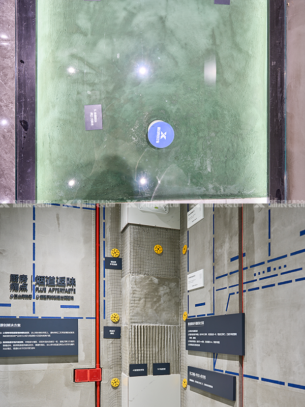 煙道與墻體接觸位置六面掛網(wǎng),瓷磚貼到頂加固