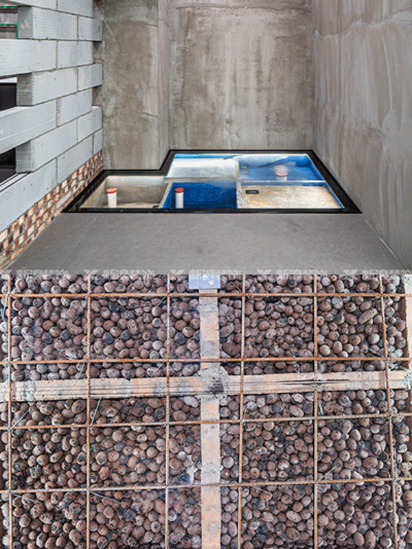 紅磚起底,輕質(zhì)磚交錯,在每隔50公分高度壓一盤紅磚