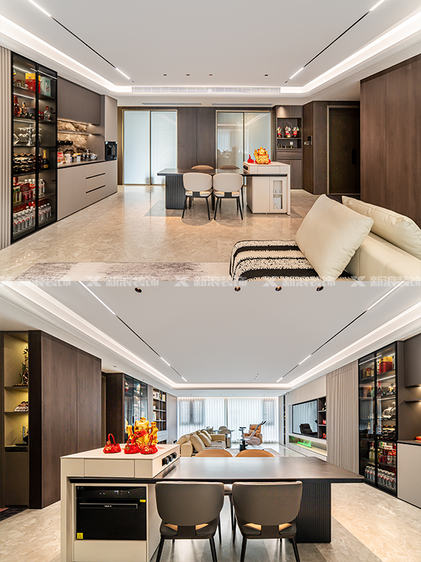 客餐廳一體設(shè)計(jì),開(kāi)放式書(shū)房與會(huì)客休閑區(qū)各有區(qū)域,動(dòng)線明晰。