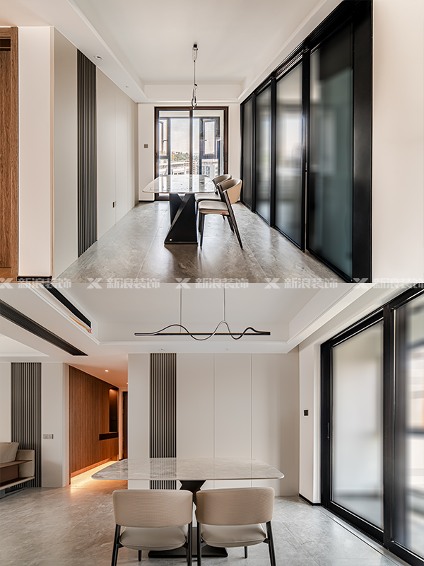 極簡邊框推拉玻璃門隔斷廚房餐廳,讓空間通透感十足,