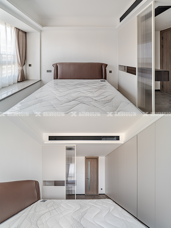 主臥做L型衣柜搭配磨砂玻璃門隔斷衣帽間,體現(xiàn)出意式的低調(diào)高級(jí)感。