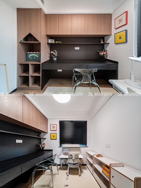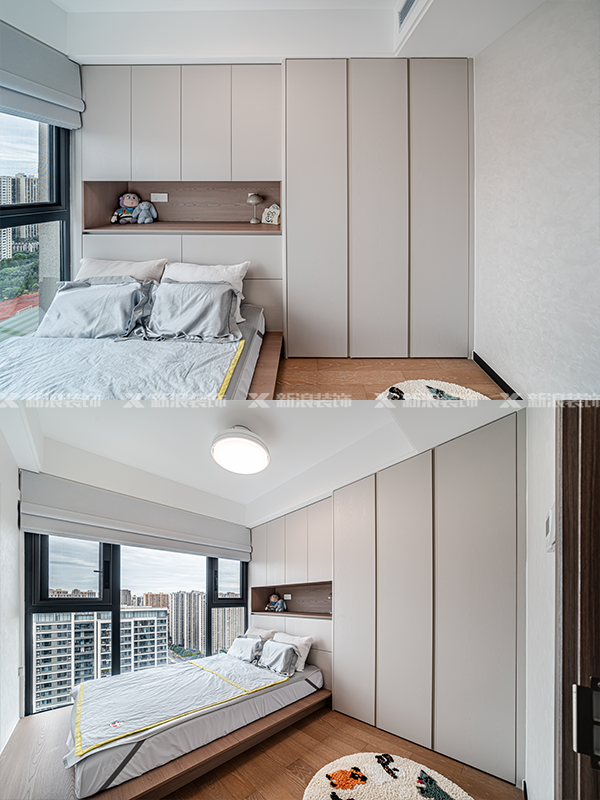 兒童房打破傳統(tǒng)設(shè)計(jì),地臺(tái)床讓活動(dòng)空間更集中,免拉手衣柜也能很好避免磕碰。