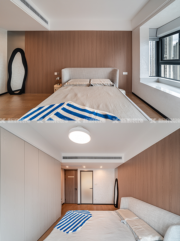 臥和沙發(fā)背景均為平板統(tǒng)一橡木色,搭配銀色拉絲做點(diǎn)綴,未做格柵等造型,簡(jiǎn)約有格調(diào)。
