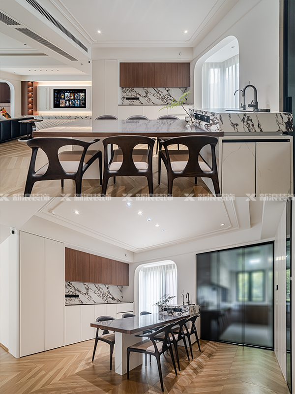 餐廳餐島臺(tái):大理石臺(tái)面搭配胡桃木柜體和黑色金屬元素,精致又實(shí)用!早餐臺(tái)、收納柜、社交區(qū)三合一,誰(shuí)看了不夸一句高級(jí)感爆棚
