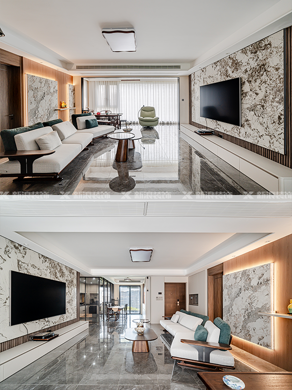 全屋定制柜體選用「摩卡棕橡+象牙灰」雙拼色,電視墻&沙發(fā)背景墻通鋪同色系巖板,搭配暖調燈帶氛圍感直接拉滿~誰說深色系不能溫柔?我家就是行走的輕奢范兒!