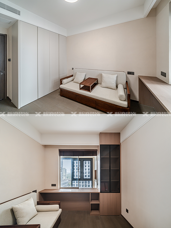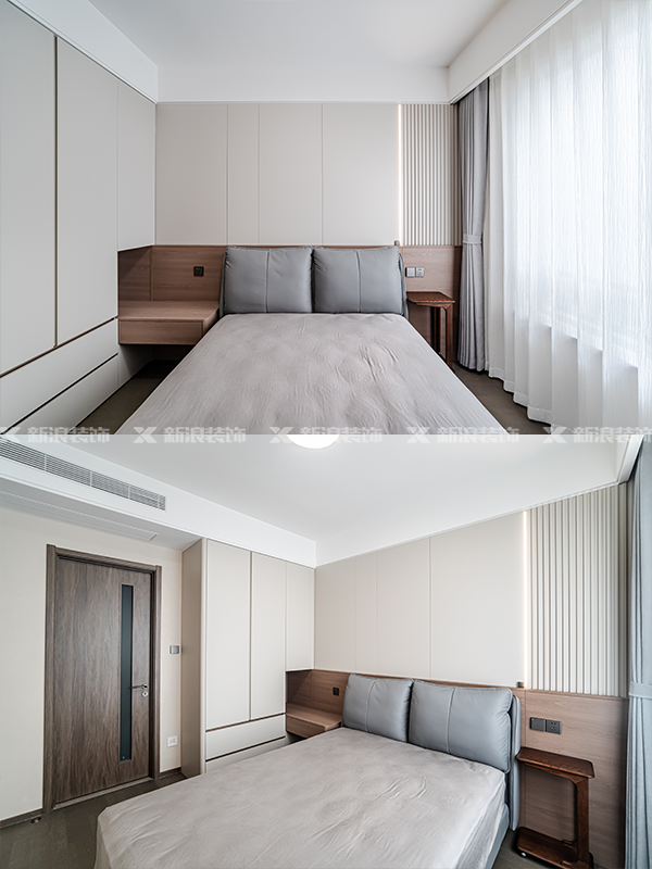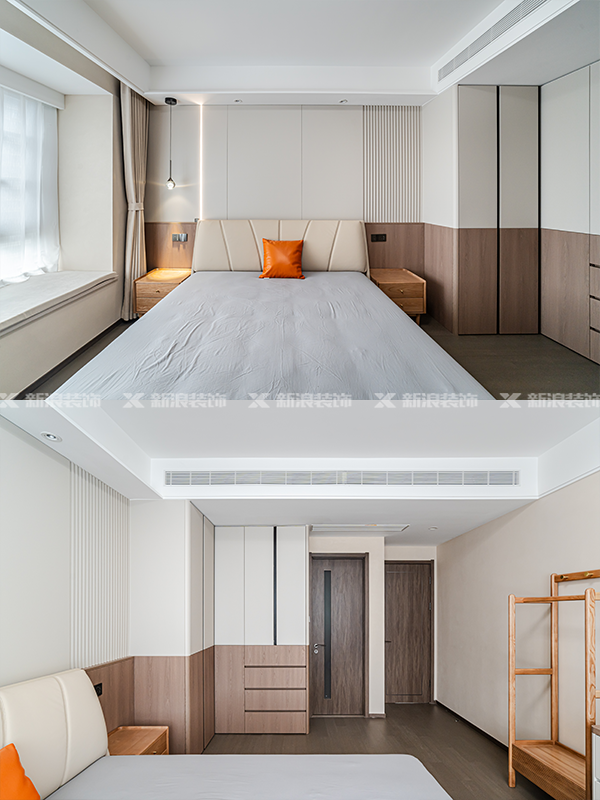 主臥衣柜拼色設計:背景墻延伸出的胡桃木色+奶咖柜門,轉角做圓弧處理安全感爆棚