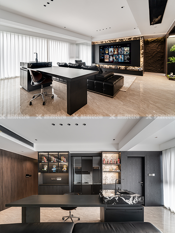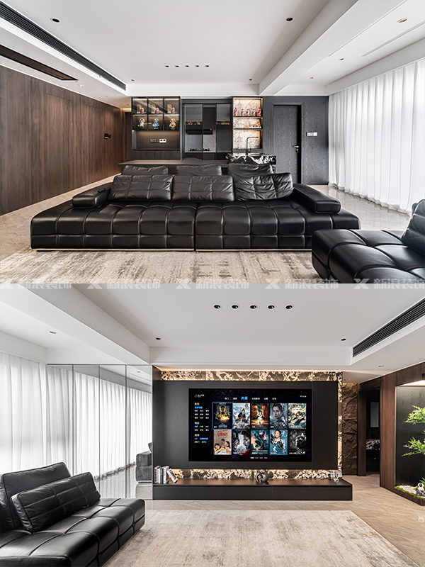 入戶的位置做了一組夾吊的玄關(guān)設(shè)計(jì),PU石皮和寶格麗黑大理石搭配起來也非常協(xié)調(diào)。走道的PU石皮端景也是精致十足。大理石的元素貫穿全屋,意式風(fēng)滿滿。