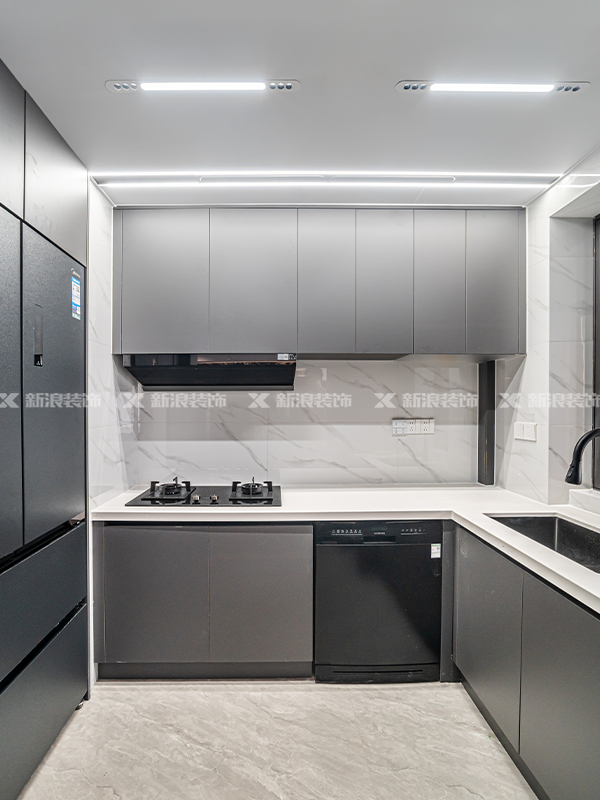特別有意思的是廚房的一些小設(shè)計(jì),讓原本狹窄的廚房可以通過這些小空間來發(fā)散它的收納能力。外部利用了兩邊的墻面打造了兩組餐邊柜,方便收納的同時也能讓客廳看起來更加的整潔。