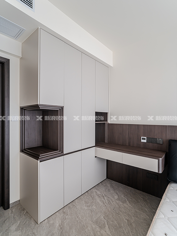 臥室配置半墻床頭背景、衣柜書桌一體設(shè)計(jì)、斯帕卡疊級開放格、拼色床頭背景、圓弧造型設(shè)計(jì)等,精心打造舒適休息空間。