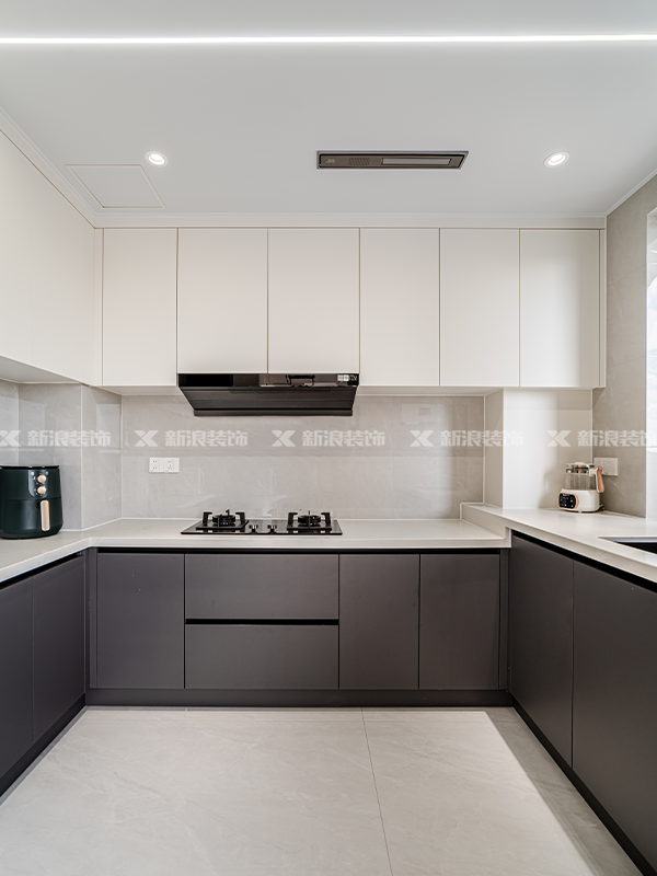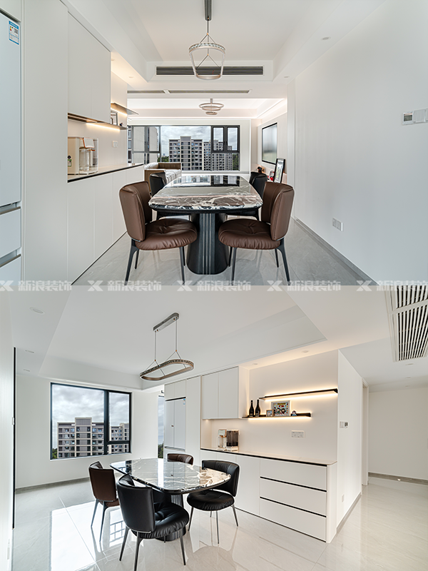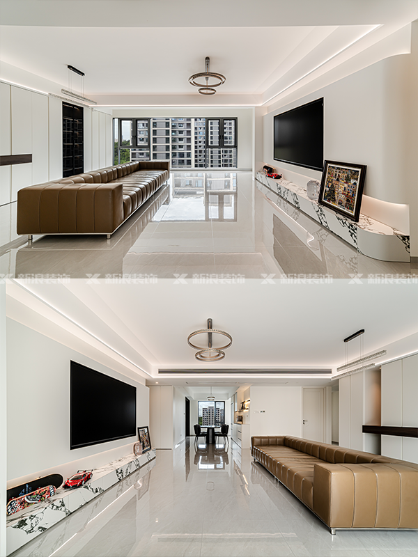 吊頂不做復(fù)雜造型,主燈和邊緣氛圍線(xiàn)燈呼應(yīng),不壓層高。