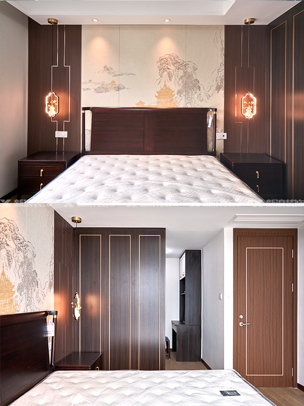 全屋門墻柜一體化定制,采用新中式流行黑胡桃色系,讓新中式更有那味兒了!
